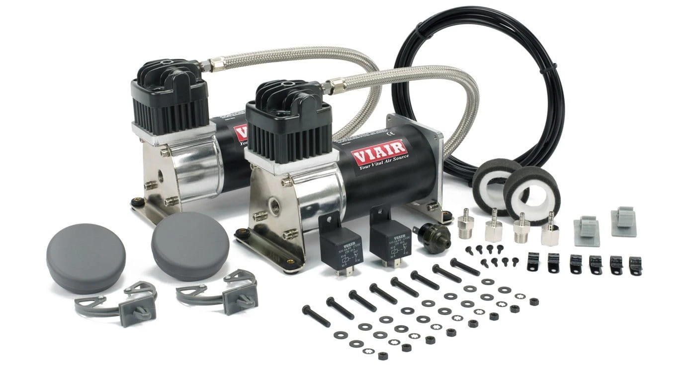 Step up your onboard air game with the dynamic duo of compressors, the Viair 280C Black and Silver dual-pack! One 280C is all you need for tanks up to 2.5 gallons, but why settle when you can power tanks up to 5-gallons with two? Fill your tank lightning fast, recharging a 2-gallon tank from 110-145 PSI in just 29 seconds and a 5-gallon tank in 1 minute and 11 seconds. And the best part? The Viair 280C only pulls 45 amps from your battery. Ideal for air suspension systems and powering HornBlasters train horns!